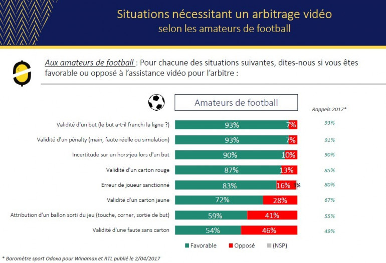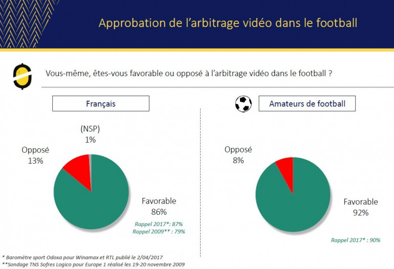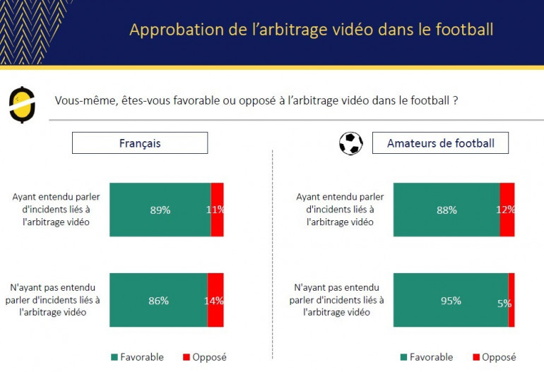 86% des Français et 92% des amateurs de football y sont aujourd’hui favorables. C’est donc une approbation massive. Même ceux qui déclarent avoir entendu parler d’incidents soutiennent très majoritairement son introduction (89% des Français et 88% des amateurs de football ayant entendu parler d’incidents).
