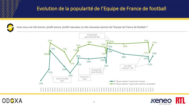 Cette remontée permet aux Bleus de retrouver le niveau de popularité observé avant l’élimination en 8e de finale de l’Euro par la Suisse. À 13 mois de la Coupe du monde 2022 au Qatar, les bonnes opinions chez les amateurs de football retrouvent quasiment leur sommet (autour de 9 personnes sur 10). Auprès du grand public, elles restent encore nettement en deçà de leur niveau record : 79% avant la finale France-Croatie 2018.