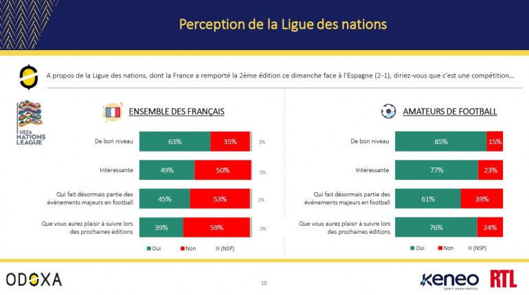 Alors que 47% des Français et 40% des amateurs de football jugeaient qu’elle était trop compliquée et difficile à suivre lors de son lancement en août 2018 (sondage Odoxa pour RTL et Groupama), la Ligue des Nations semble s’être intégrée dans leur agenda sportif.