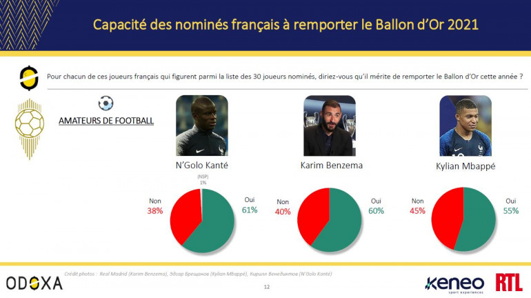 61% d’entre eux jugent que le milieu de Chelsea, vainqueur de la Ligue des champions, mérite de remporter le trophée et ils sont 60% à le penser pour l’attaquant du Real Madrid. Kylian Mbappé figure légèrement en retrait : 55% des amateurs de football estiment qu’il mériterait de gagner le trophée individuel le plus prestigieux de sa discipline.