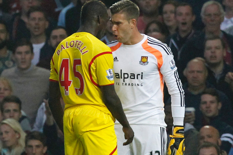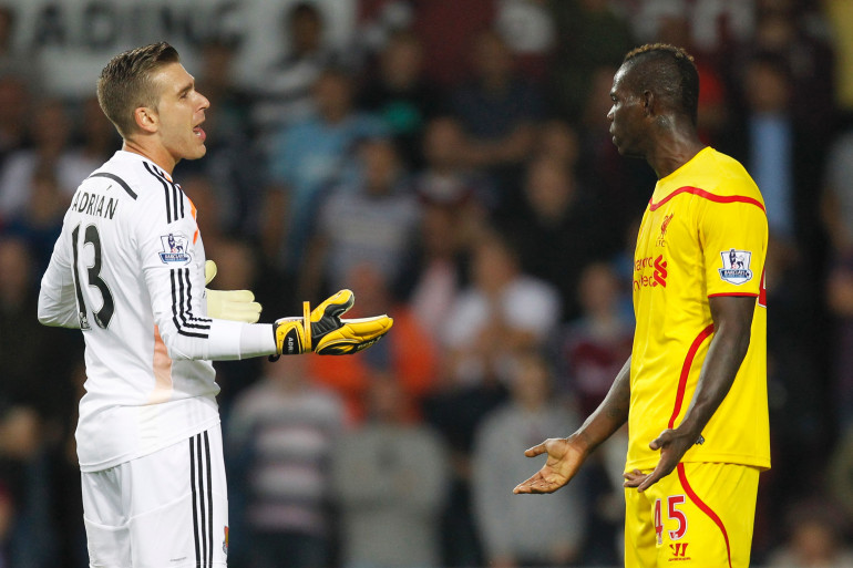Mario Balotelli s'explique avec Adrian lors du match West Ham-Liverpool, le 20 septembre 2014