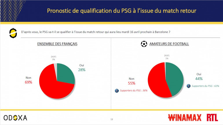 Enfin, 44% des amateurs de football pensent que le PSG pourra se qualifier à l'issue du match retour, à mi-chemin entre des supporters du PSG résolument optimistes (63%) et des Français qui le sont nettement moins (28%).