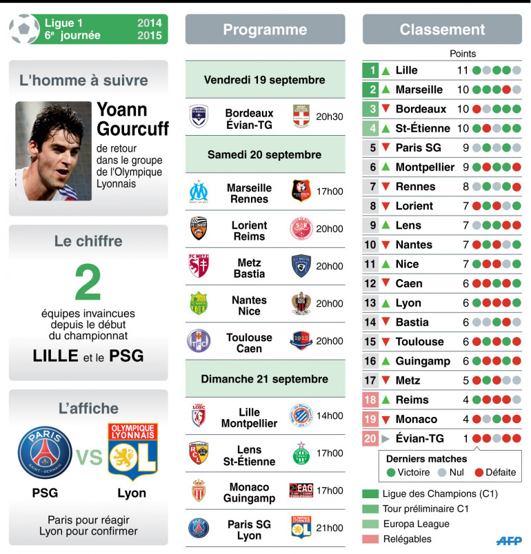 Par ailleurs, cette 6e journée sera notamment marquée dimanche (21h) par le déplacement de Lyon au Parc des Princes, le double champion de France parisien étant dans l'obligation de s'imposer pour chasser les petits nuages encore visibles mercredi en Ligue des champions sur la pelouse de l'Ajax Amsterdam (1-1).