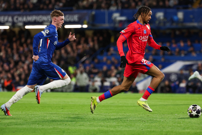 Cole Palmer et Bradley Barcola lors du match de la Ligue des champions entre Chelsea et le PSG le 17 mars 2026