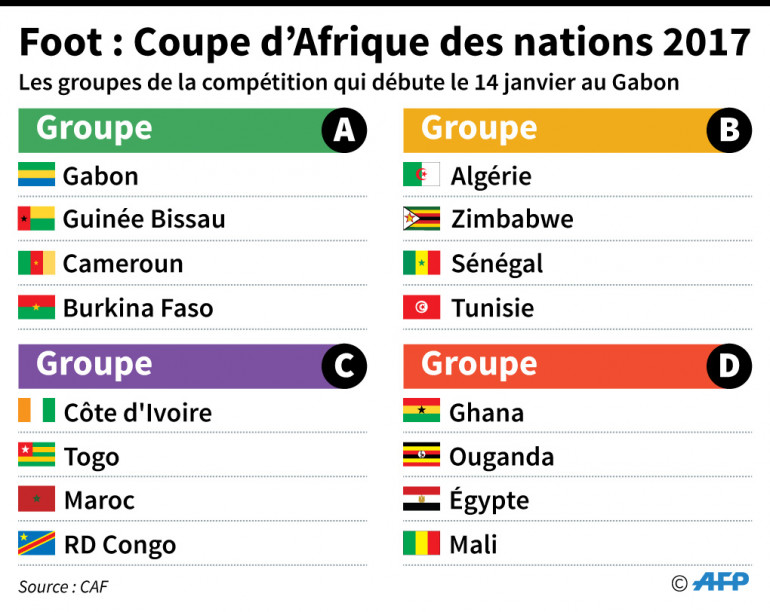 Les quatre villes retenues pour l'accueil des 32 rencontres sont Libreville (stade d'Agondjé, 45.000 places), Port Gentil (stade de Port-Gentil, 25.000), Franceville (stade de Franceville, 20.000) et Oyem (stade d'Oyem, 20.000). Il y a deux ans, la victoire était revenue à la Côte d'ivoire d'Hervé Renard face au Ghana au terme d'une folle séance de tirs au but (0-0 après prolongation, 9 tirs à 8).