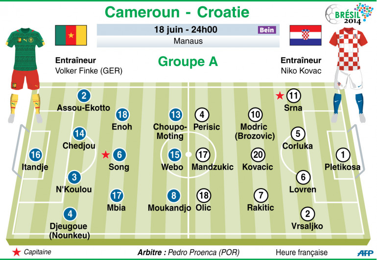 Tous deux battus lors de leur premier match, le Cameroun, probablement sans Eto'o, et la Croatie, avec un Modric "à 100%" selon son sélectionneur, disputent mercredi un match inédit et bouillant à Manaus (minuit).