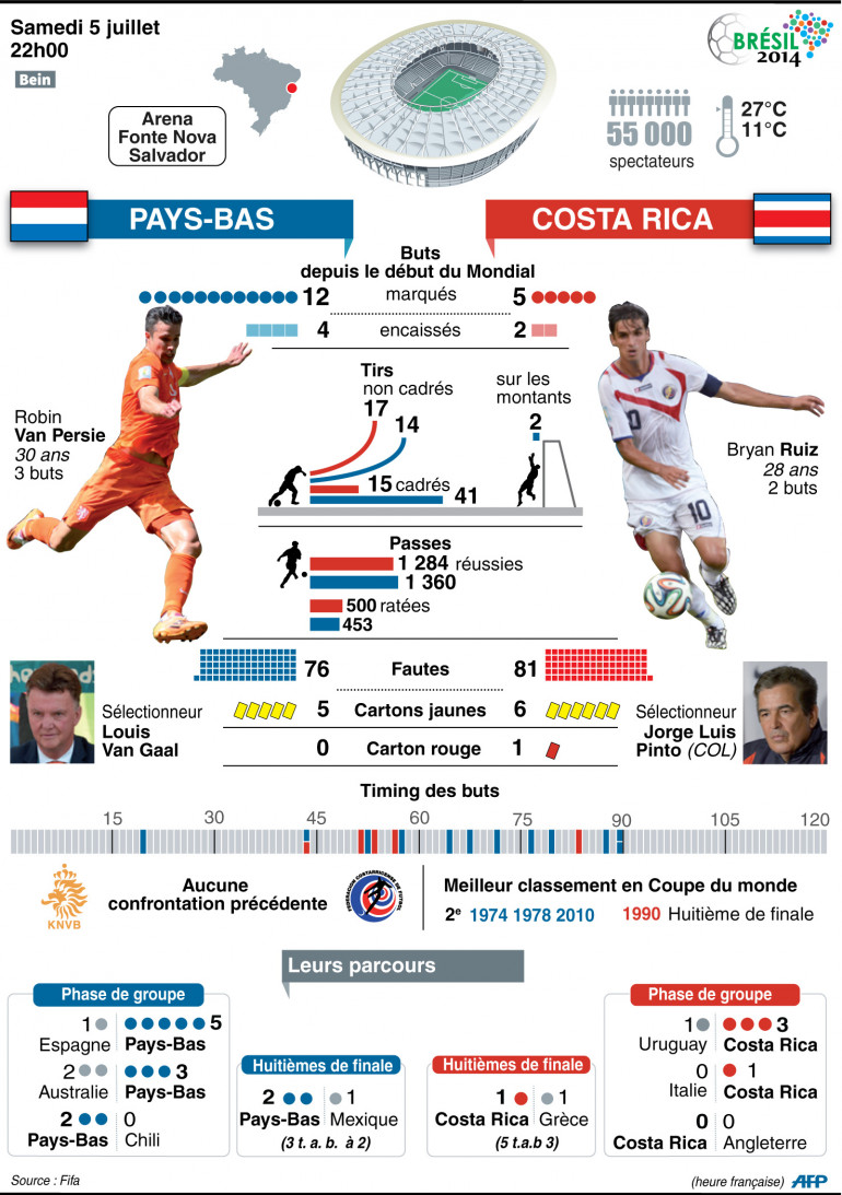 Finalistes de la dernière édition de la Coupe du monde en Afrique du Sud, les Pays-Bas n'allaient pas faire peur au Costa Rica qui avait déjà accroché l'Uruguay, l'Italie et la Grèce à son tableau de chasse brésilien. Comme pour son huitième de finale, le Costa Rica s'est démené pendant quatre mi-temps face au finaliste de 2010 qui arrache donc sa qualification lors d'une ultime séance de tirs au but.