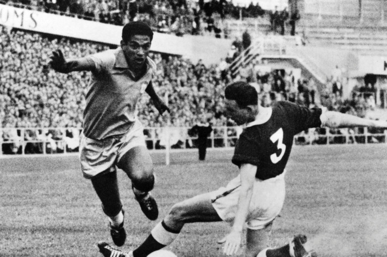 Mané Garrincha, "l'ange aux jambes tordues" (1933-1983). Il reste célèbre pour ses dribbles déconcertants malgré un physique étrange : petit avec des jambes incurvées vers l'intérieur. Il popularisa les passements de jambes et les feintes de corps, qu'il porta à un niveau jamais atteint.