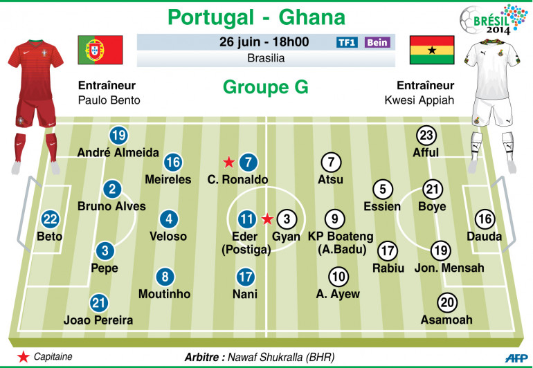 La situation du Ghana est meilleure. Avec une victoire allemande de plus d'un but, une simple victoire contre le Portugal les qualifie. Toutefois, la préparation du match a été plombée par des problèmes d'argent. Ils ne se sont pas entraînés lundi en raison de problèmes de primes de participation qui n'ont pas été réglées. Le président de la République John Dramani Mahama est entré lui-même dans l'arène, promettant que l'argent sera versé, et un avion a décollé du Ghana vers le Brésil avec trois millions de dollars pour les Black Stars.