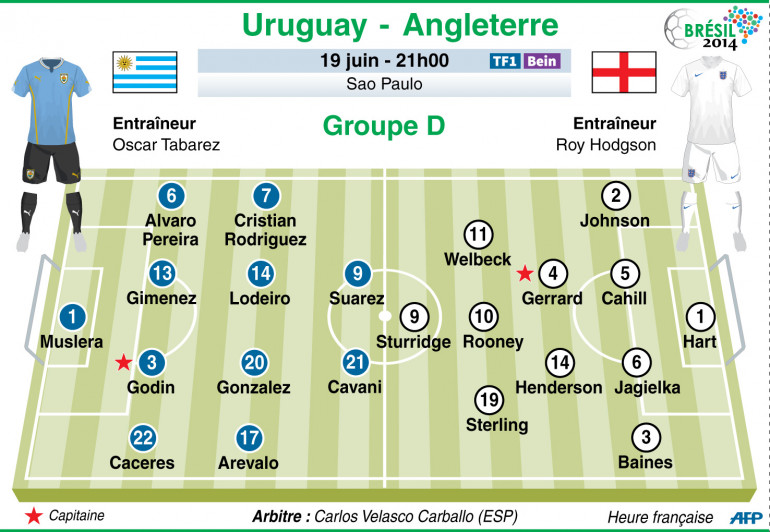 Battus lors de leur premier match dans le groupe D, l'Uruguay (contre le Costa Rica) et l'Angleterre (contre l'Italie) se défient à l'Arena Corinthians de São Paulo (21 heures) dans une partie qui pourrait être synonyme de retour prématuré à la maison pour le perdant.