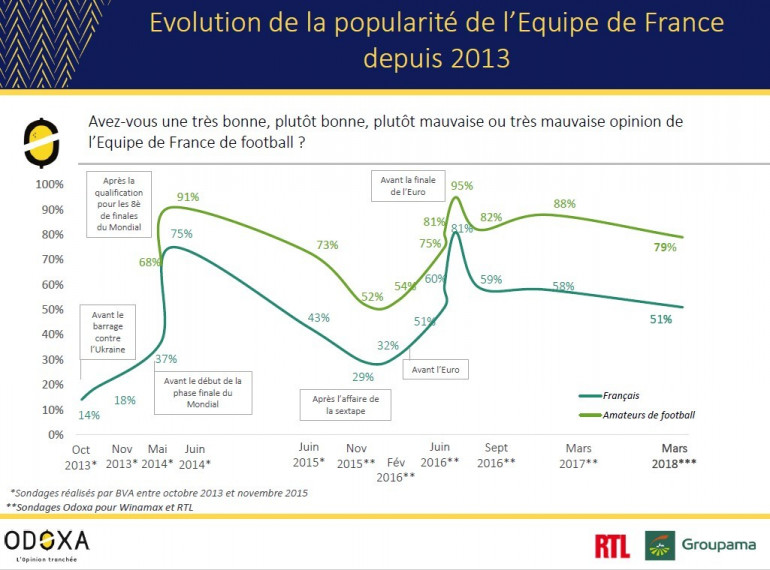 même été bien plus faible, notamment avant la qualification de justesse face à l’Ukraine (14% en octobre 2013) et durant l’affaire de la "sextape" (29% en novembre 2015).