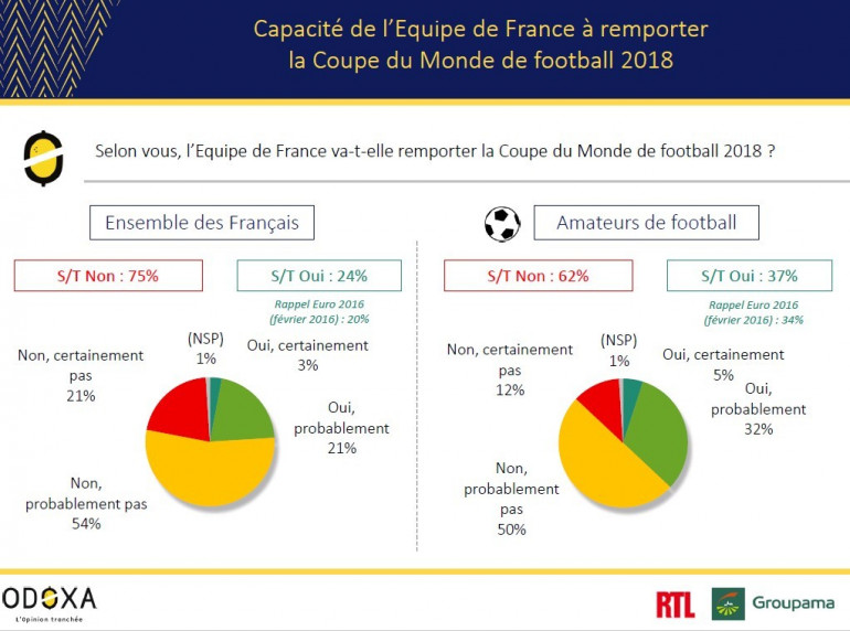 Chez les amateurs de football ce chiffre grimpe à 37%. À pareille époque avant l'Euro 2016, seuls 20% des Français et 34% des amateurs de football croyaient les Bleus capables de l’emporter.