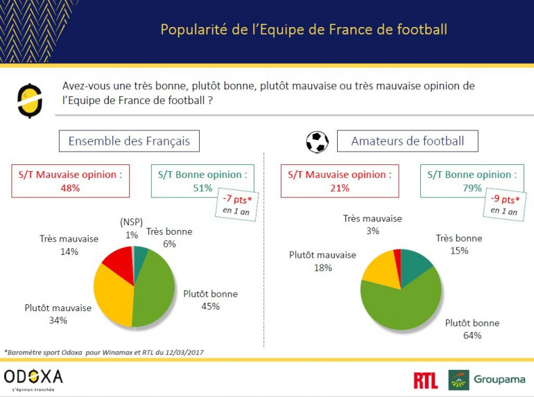 Voici les principaux enseignements du sondage réalisé par Odoxa pour RTL et Groupama sur internet les jeudi 22 et vendredi 23 mars, auprès d'un échantillon de 1.018 personnes représentatives de la population française âgée de 18 ans et plus, parmi lesquelles 383 amateurs de football, selon la méthode des quotas.