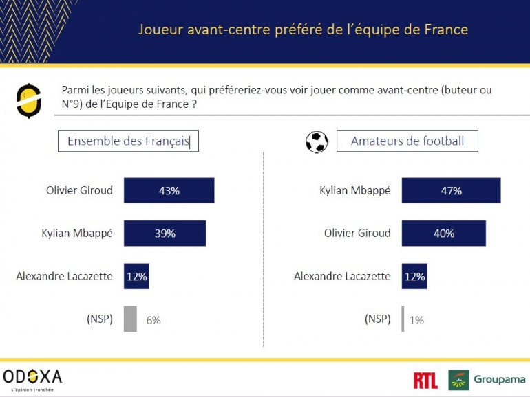 Qu’en pensent les Français ? Parmi le grand public, le joueur de Chelsea devance le Parisien de 4 points (43% contre 39%). Mais chez les amateurs de football, c’est Mbappé qui doit tenir ce rôle (47% contre 40%). Alexandre Lacazette est largement distancé (12%).