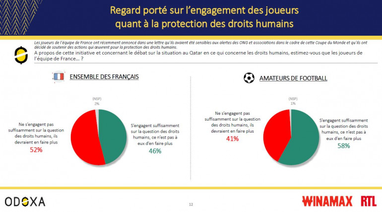Les Français accueillent évidemment positivement cette annonce, mais cela ne va pas assez loin pour la majorité d’entre eux. 52% considèrent en effet que les Bleus ne s’engagent pas suffisamment sur la question des droits humains et qu’ils devraient en faire plus. Les amateurs de football considèrent en revanche en majorité (58%) qu’ils s’engagent déjà suffisamment et que ce n’est pas à eux d’en faire plus.