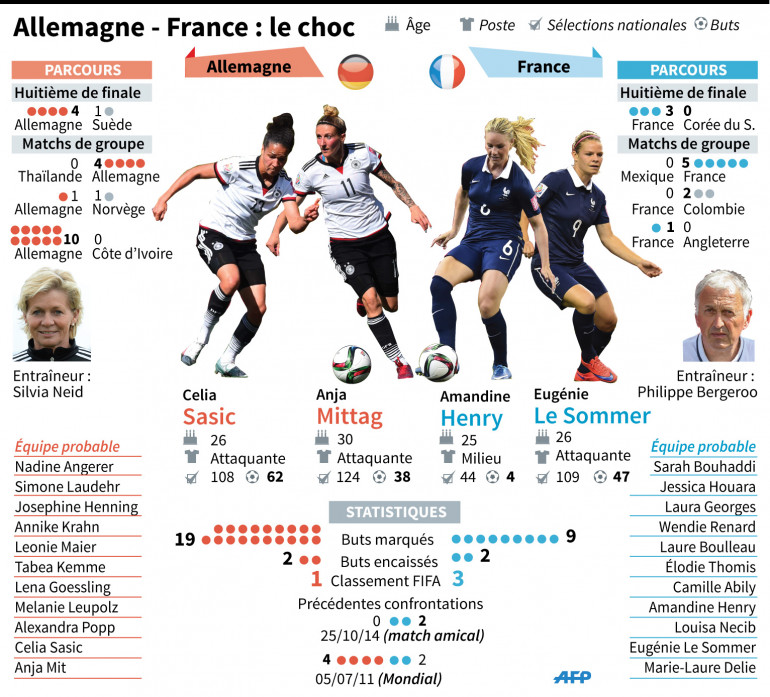 L'Allemagne, c'est 250.000 licenciées, deux Coupes du monde au palmarès (2003 et 2007), huit titres européens dont les sept derniers depuis 1995, trois médailles de bronze aux JO, neuf sacres de l'un de ses clubs en Ligue des champions. De son côté, la France a disputé deux phases finales d'un Mondial, avec une 4e place en 2011, cinq d'un Euro (quart en 2009 et 2011), également fini 4e des JO 2012 et remporté deux fois la C1, grâce à Lyon en 2011 et 2012.