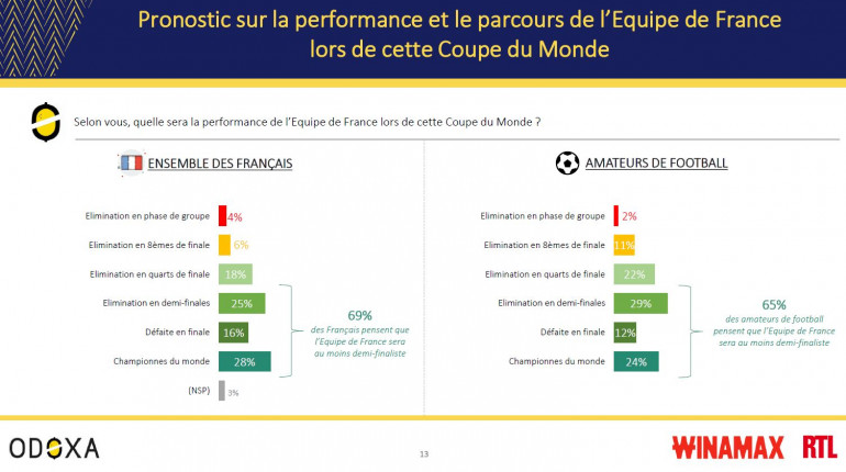 Voici les principaux enseignements du dernier sondage réalisé par Odoxa pour Winamax et RTL. L'enquête a été réalisée selon la méthode des quotas sur internet les mercredi 12 et jeudi 13 juillet 2023 auprès d'un échantillon de 1.005 personnes représentatives de la population française âgée de 18 ans et plus, parmi lesquelles 430 amateurs de football.