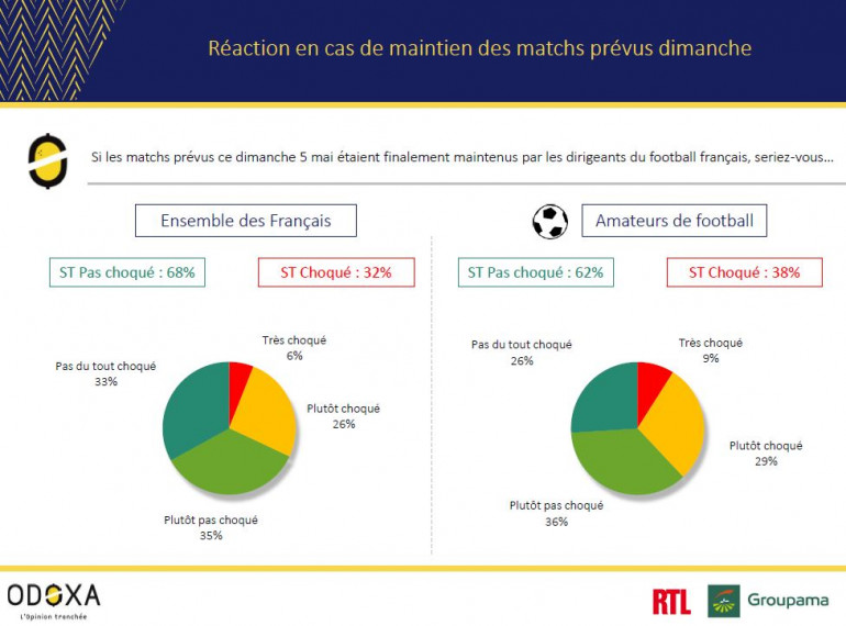 Pour autant, ni les Français (68%) ni les amateurs de football (62%) ne seraient choqués si les matchs prévus ce dimanche 5 mai étaient finalement maintenus par les dirigeants du football français.