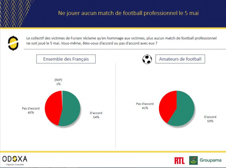 54% des Français et 59% des amateurs de foot sont d’accord avec le collectif des victimes de Furiani pour réclamer, qu’en hommage aux victimes, plus aucun match de football professionnel ne soit joué le 5 mai.