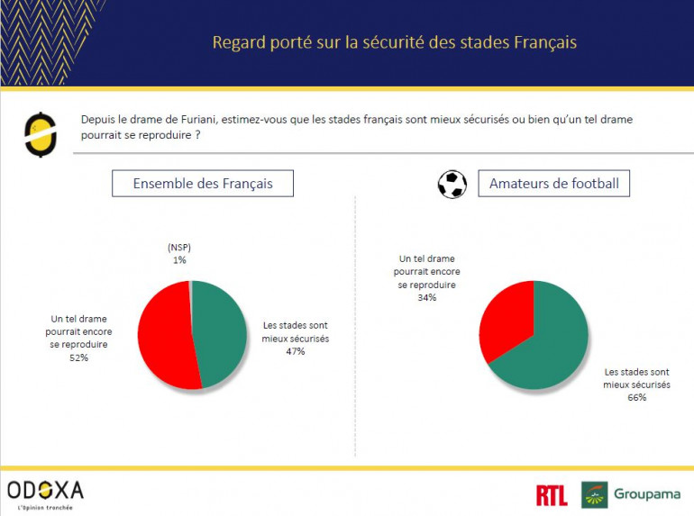 Heureusement, les deux-tiers des amateurs de football (66%) estiment qu’aujourd’hui les stades sont mieux sécurisés. Les Français dans leur ensemble, sont un peu plus pessimistes que les amateurs de foot : ils sont, eux, un peu plus d’un sur deux (52%) à penser qu’un tel drame pourrait se reproduire. Puissent les premiers avoir raison et les seconds se tromper