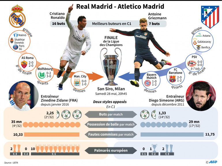 20h02 - Le Real Madrid est le club le plus titré en Ligue des champions (10) devant l'AC Milan (7), le Bayern Munich et le FC Barcelone (5). L'Atlético atteint la finale pour la 3e fois de son histoire après 1974 et 2014.