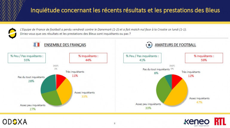 L’équipe restait sur sept victoires consécutives depuis le mois de septembre 2021. À moins de six mois de la Coupe du monde au Qatar, ces résultats sont-ils inquiétants ? 44% des Français et surtout 59% des amateurs de football le pensent. Il reste néanmoins deux matchs, face à l’Autriche vendredi 10 juin (20h45) et de nouveau face à la Croatie lundi 13 juin (20h45) pour rassurer le public.