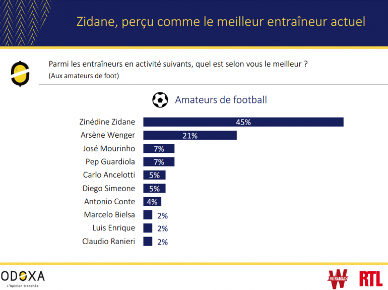 Il est clair que les réponses sont orientées par le patriotisme des interrogés. Selon les amateurs de football, Zinédine Zidane et Arsène Wenger (Arsenal) sont, à l'heure actuelle, les deux meilleurs techniciens du monde. Le premier obtient 45% des voix contre 21% pour l'Alsacien.