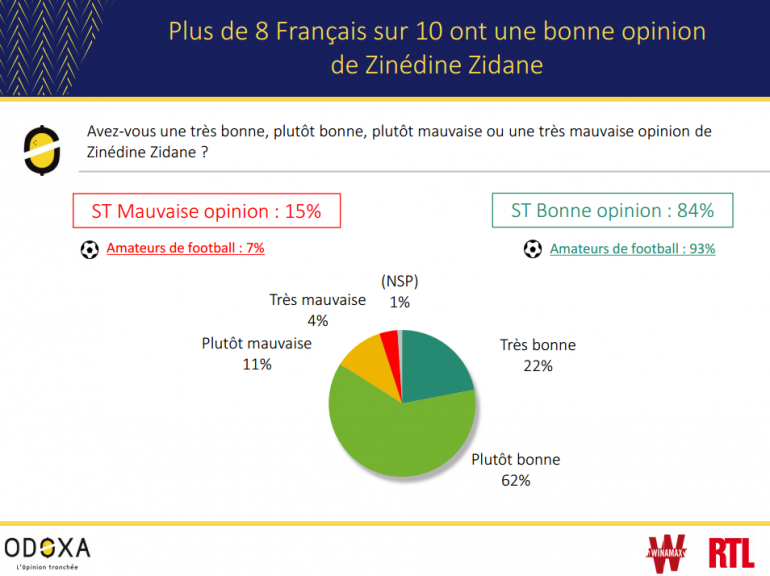 En plus de gagner, le champion du monde 1998 manage parfaitement son groupe et gère ses relations avec la presse d'une main de maître. Des facilités qu'il exprime en Espagne mais qui se répercutent également sur le public français. Seulement 15% d'entre eux (et 7% des amateurs de football) ont une mauvaise opinion de Zidane. Au contraire 93% des amateurs de football sont séduits par le technicien. 62% en ont une "plutôt bonne opinion" et 22% une "très bonne".