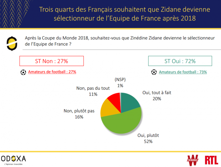 Après le tournoi russe la France aura pour principaux objectifs de se qualifier pour l'Euro 2020 (organisé sur tout le continent) et la Coupe du monde 2022, au Qatar. Un Français sur cinq est "tout à fait d'accord" pour que Zidane dirige les Bleus à cette époque contre 27% qui ne semblent pas favorable.