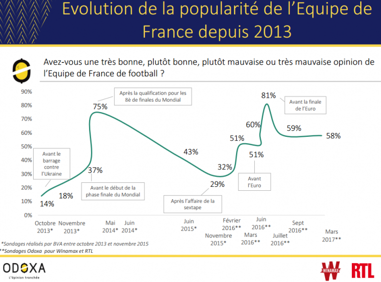 Des hauts et des bas qui se répercutent directement dans ce dernier graphique représentatif de la réputation des Bleus. Avant le barrage contre l'Ukraine, 14% des Français avait une bonne opinion, 75% après la qualification en huitième de finale du Mondial brésilien, 29% après l'affaire de la sextape, 81% lors de la cruelle finale du 10 juillet dernier et 58% en mars 2017.