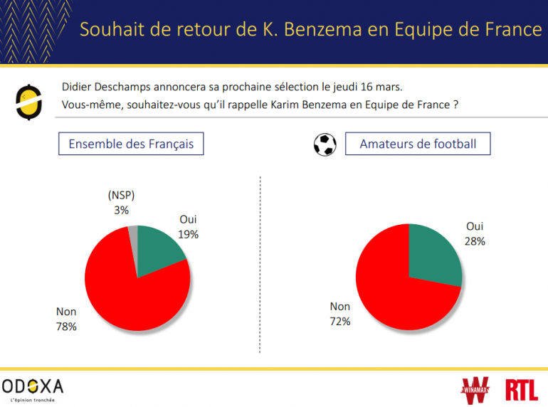 Les Français ne semblent pas pressés de revoir Karim Benzema sous le maillot de l'équipe de France. Laissé sur le bord de la route depuis octobre 2015 et l'affaire de la "sextape", il a manqué le bon parcours des Français lors de l'Euro 2016 (finaliste déchu face au Portugal). 78% des Français ne souhaitent pas le retour l'attaquant du Real Madrid à Clairefontaine. Chez les amateurs de football, un gros quart des interrogés sont pour son retour.