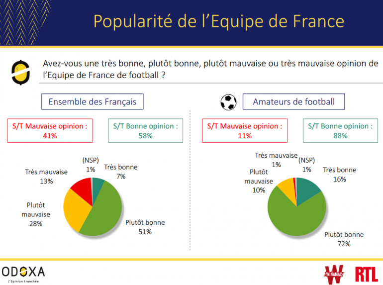 Sur l'ensemble des interrogés, ils sont tout de même 41% à ne pas avoir une bonne opinion des Bleus. Chez les amateurs de football, les résultats sont plus cléments. Ils sont 88% à avoir répondu positivement à la question. Un seul et petit pourcent se fait une très mauvaise opinion des vice-champions d'Europe.
