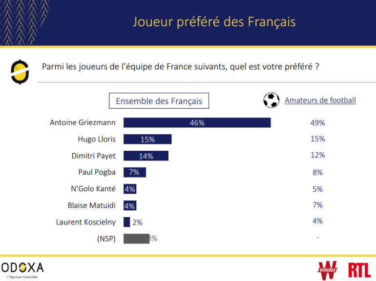 Le gaucher de l'Atlético de Madrid est, et de loin, le joueur préféré des Français. Parmi les internationaux français, il rafle presque la moitié des suffrages chez les Français (46%) et les observateurs de football (49%). Une popularité gagnée grâce à ses performances sportives (double buteur face à l'Irlande et l'Allemagne) mais aussi son image. Le capitaine le suit avec 15% des votes alors que le Réunionnais en récupère 14%.