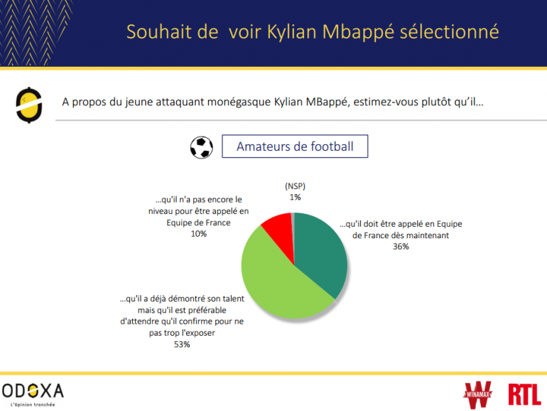Une première certainement désirée par le principal intéressé, un peu moins pour les amateurs de football. Seuls interrogés dans ce cas, ils sont seulement 10% à penser que le joueur n'a pas encore le niveau international. La majorité (53%) pense en revanche qu'il a les capacités pour intégrer le groupe France mais que Deschamps devrait patienter pour lui offrir sa première sélection. Plus d'un tiers des sondés (36%) veut le voir dès la semaine prochaine avec le maillot frappé du coq.