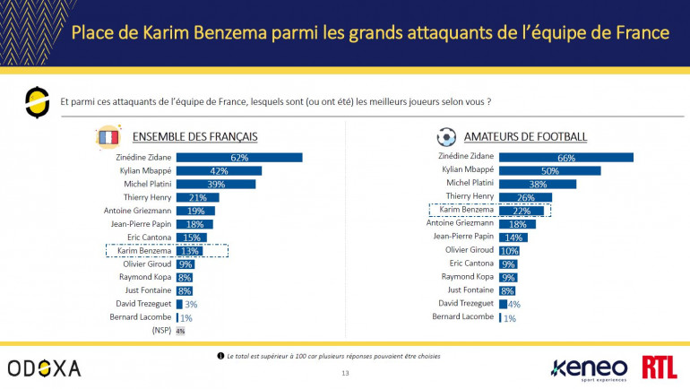 Les quatre autres joueurs qui figurent devant l'ancien Lyonnais sont Thierry Henry (21%), Antoine Griezmann (19%), Jean-Pierre Papin (18%) et Éric Cantona (15%). Benzema devance Olivier Giroud (9%), Raymond Kopa et Just Fontaine (8%).