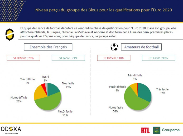 Est-ce une formalité pour les champions du monde en titre ? Pour les Français, il n’y a aucun doute. 71% d’entre eux estiment que ce groupe est facile (19% très facile, 52% plutôt facile). Les amateurs de football sont encore plus catégoriques : 90% le jugent facile (32% très facile).