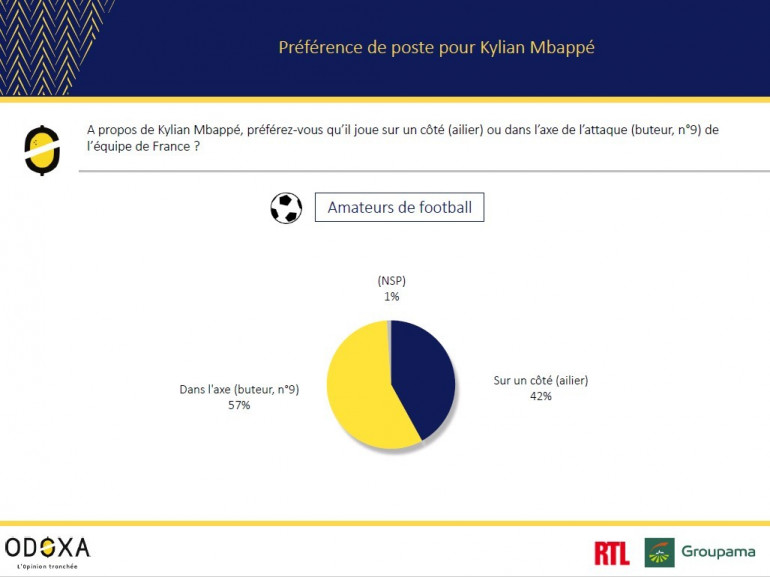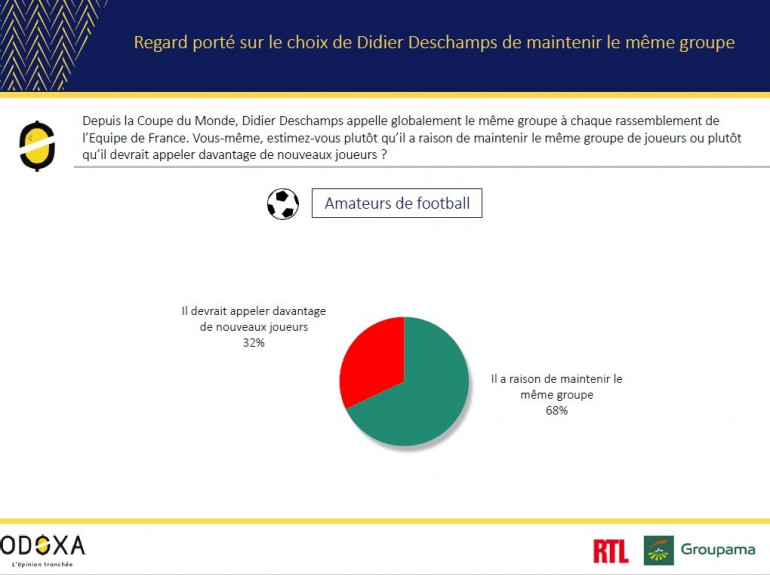 Le sélectionneur a raison de maintenir sa confiance au même groupe depuis le sacre en Russie, estiment aussi 68% des passionnés, qui sont par ailleurs 58% à préférer voir Kylian Mbappé dans l'axe de l'attaque plutôt que sur un côté. Voici les principaux enseignements du dernier sondage réalisé par Odoxa pour RTL et Groupama.