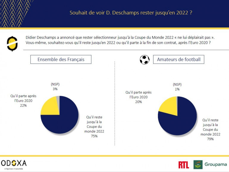 Interrogé récemment sur son aventure au poste de sélectionneur, l'homme de 50 ans a concédé qu’aller jusqu’à la Coupe du Monde 2022 au Qatar "ne lui déplairait pas". Comme le montre notre sondage, cela ravirait aussi les Français. 75% d’entre eux et 79% des amateurs de football souhaitent qu’il prolonge.