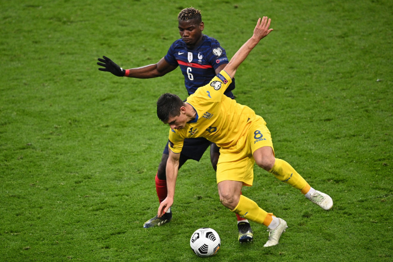 Paul Pogba au duel avec Ruslan Malinovskyi le 24 mars 2021 à Saint-Denis