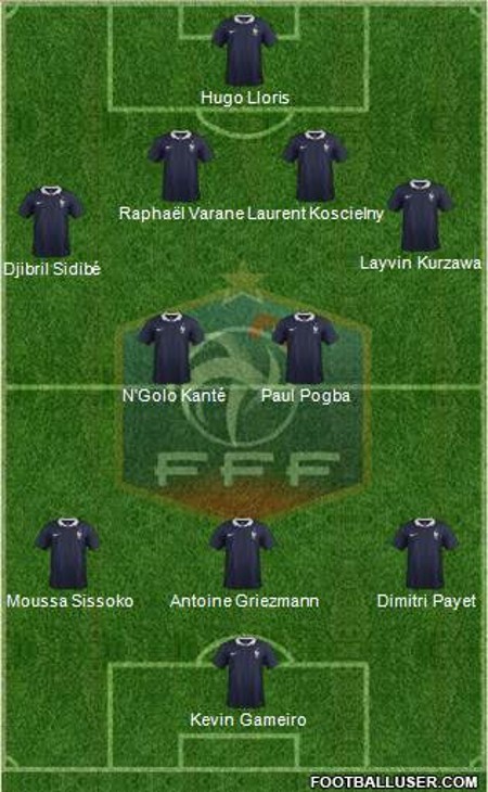 La charnière centrale Varane-Koscielny paraît intouchable. Sur le côté droit de la défense, Djibril Sidibé devrait avoir encore sa chance, devant Bacary Sagna. À gauche, Kurzawa a une longueur d'avance sur Digne bien qu'il joue peu avec Paris. Au milieu, on peut compter sur un possible schéma à deux axiaux, à l'image de la configuration de l'Euro. Paul Pogba et N'Golo Kanté devraient prendre place, à moins que Matuidi viennent prendre la place du joueur de Chelsea. Dans cette configuration, Moussa Sissoko est incontournable à droite dans ce 4-4-2 afin de bénéficier de son abattage et son volume de jeu.