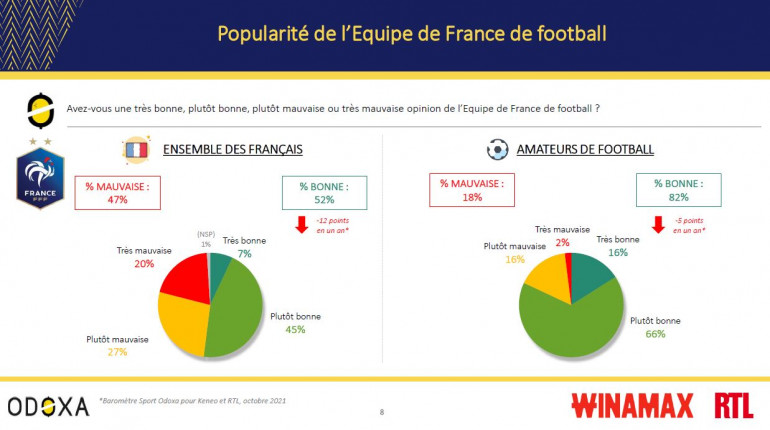 Dans ce contexte, la popularité de l’équipe de France recule significativement. 52% des Français et 82% des amateurs de football ont aujourd’hui une bonne opinion de l’équipe de France, ce qui est respectivement 12 points et 5 points de moins qu’il y a un an, en octobre 2021, au sortir du succès des Bleus en Ligue des Nations.
