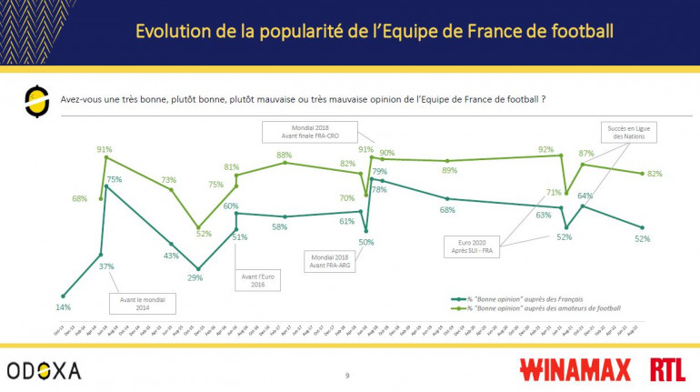 Dans l’opinion, l’équipe de France retrouve un niveau de popularité comparable à celui que nous mesurions avant la Coupe du monde 2018 ou juste après la désillusion sportive de l’élimination par la Suisse à l’Euro 2021, perdant donc dans l’esprit des Français son auréole de championne de monde en puissance.