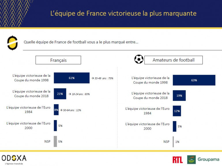 À la 2e place, on retrouve d’autres champions du monde, ceux de 2018. 21% des Français et 19% des amateurs de football les désignent comme l’équipe de France la plus marquante. Les couronnes européennes de 1984 (8% et 12%) et de 2000 (5% et 5%) récolent les quelques miettes laissées par les titres mondiaux.