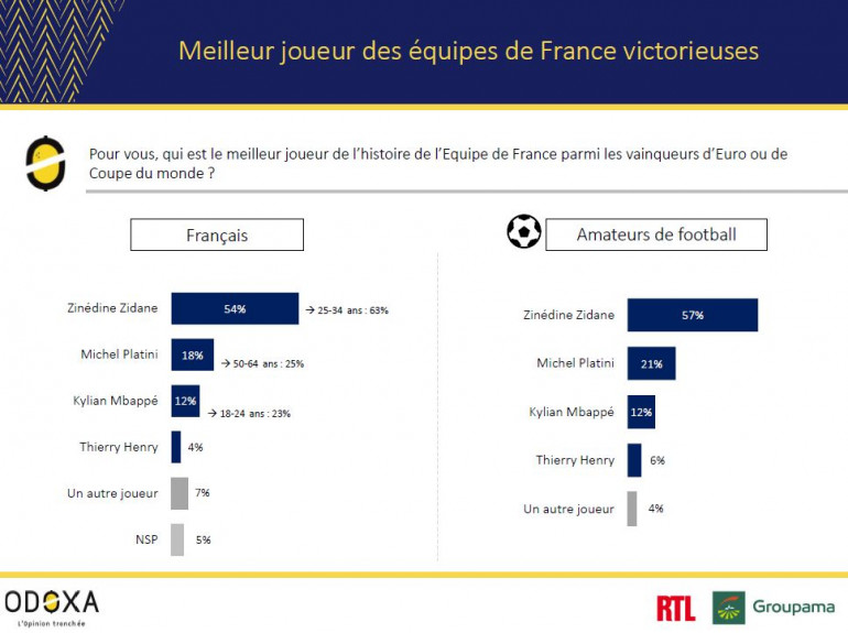 L'un de ses quatre hommes planent au dessus des autres. Pour 54% des Français et 57% des amateurs de football, Zidane est le meilleur joueur de l’histoire de l’équipe de France. Il devance l’autre n°10 légendaire des Bleus, Michel Platini (18% et 21%). Du haut de ses 21 ans, Kylian Mbappé est tout de même déjà désigné par 12% des Français et des amateurs de football et 23% des 18-24 ans.