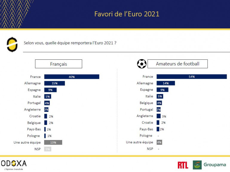 À la 2e place des pronostics des Français figure l’Allemagne (15% et 14%) L’Espagne complète le podium (9% et 9%). On retrouve ensuite l’Italie (5% et 5%), le Portugal (4% et 3%) ou encore l’Angleterre (3% et 3%) et la Belgique (2% et 4%).