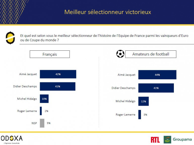 Quant à Michel Hidalgo (10% et 12%) et Roger Lemerre (2% et 3%), leur titre européen ne leur permet pas de rivaliser avec les champions du monde Deschamps et Jacquet.