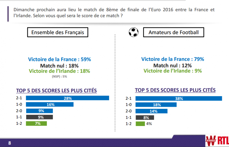 Seulement 59% des Français pronostiquent une victoire des Bleus contre l'Irlande, 18% voient un match nul et 18% une défaite. Un pourcentage largement amélioré par les amateurs de football qui sont 79% à croire en un succès de la France. Qui plus est, pour les plus optimistes, la victoire reste tout de même étriquée. 44% des sondés pensent que la France va gagner par la plus petite des marges (victoire 1-0 et 2-1). Ils ne sont que 9% à voir une victoire par deux buts d'écart (2-0).