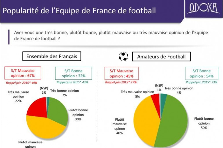 Même les amateurs de football sont sévères à l’égard de l’équipe de France : 54% d’entre eux en ont une bonne opinion, soit près de 20 points de moins qu’au printemps dernier. Le déficit de popularité de cette génération est criant par rapport aux Bleus de 1998. "Mais il faut dire que ses joueurs descendaient du bus, n’insultaient pas leur entraîneur, n’étaient pas atteints par des frasques extra sportives, ou n’étaient pas accusés de se "faire chanter" sur de scabreuses affaires de sex-tape", fait remarquer Gaël Sliman, le président d'Odoxa.