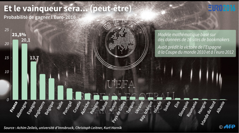 Et pour justifier le statut de l'équipe de Didier Deschamps, les mathématiques viennent en renfort de l'optimisme. En effet, selon un modèle de calcul qui prend en compte les cotes de 16 sites de paris sportifs, la France a 21,5% de chances de gagner l'Euro 2016. L'Allemagne et l'Espagne suivent dans ce classement étonnant, mais qui avait calculé le bon vainqueur de la Coupe du monde 2010 et de l'Euro 2012, en l'occurrence l'Espagne.