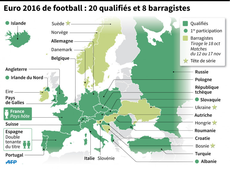 Le plateau est quasiment complet. 20 des 24 participants au 15e championnat d'Europe des nations, qui aura lieu en France du 10 juin au 10 juillet prochain, sont connus. Il s'agit de l'Albanie, l'Allemagne, l'Angleterre, l'Autriche, la Belgique, la Croatie, l'Espagne, la France, l'Irlande du Nord, l'Islande, l'Italie, le Pays de Galles, la Pologne, le Portugal, la République Tchèque, la Roumanie, la Russie, la Slovaquie, la Suisse et la Turquie. Pour les quatre derniers billets la Suède, la Bosnie, l'Ukraine et la Hongrie seront opposés en barrages au Danemark, à l'Irlande, à la Norvège ou à la Slovénie (matches aller les 12/13/14 novembre, matches retour les 15/16/17 novembre.